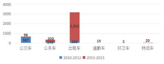 2013-2015年末,全省累计推广应用新能源汽车3,232辆,其中公共交通车98辆、公务车200辆、出租车2,912辆(含分时租赁车2,500辆)、环卫车2辆、物流车20辆。